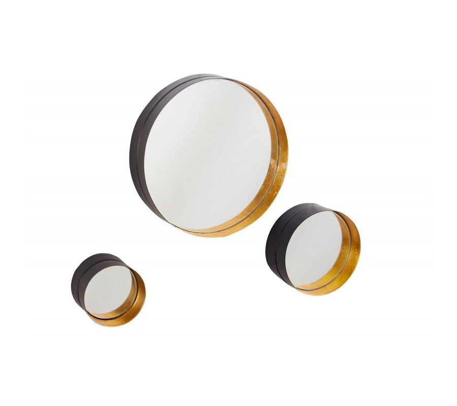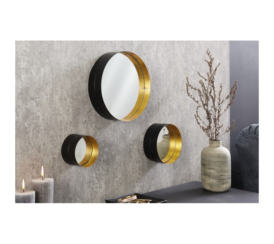 Art deco sada troch okrúhlych závesných zrkadiel Marill s čierno zlatými kovovými rámami 25cm