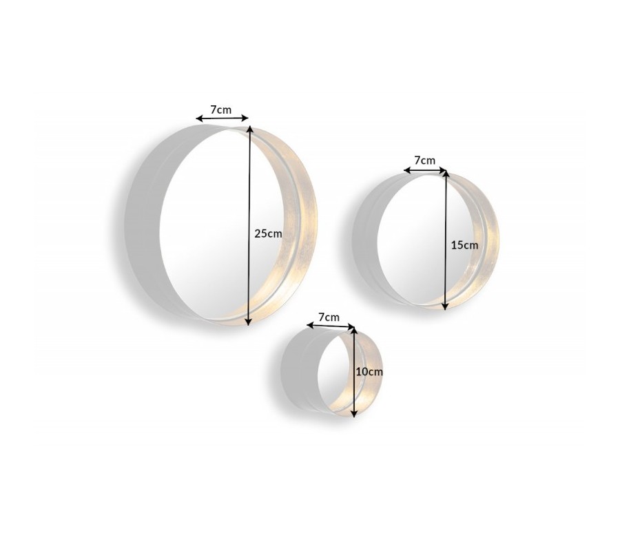 Hľadáte zaujímavý dizajnérsky kúsok do vášho moderne art deco ladeného interiéru? Sada troch okrúhlych zrkadiel Marill prináša nespočetné množstvo kombinácií ako si oživiť stenu napríklad v obývačke, predsieni či v pracovni. Sada obsahuje tri okrúhle zrkadlá v troch rôznych veľkostiach. Najmenšie zrkadlo má priemer 10cm, stredné zrkadlo má priemer 15cm a najväčšie zrkadlo disponuje priemerom 25cm. Rámy okrúhleho tvaru presahujú zrkadlovú plochu, čo pôsobí veľmi štýlovým dojmom a plochu zrkadla ohraničujú z vnútornej strany zlatou metalickou farbou a čiernou farbou z vonkajšej strany. Zrkadlá Marill v art deco štýle sa výborne hodia k modernému minimalistickému štýlu zariadenia so zlatými doplnkami. Výborne si budú rozumieť s tapetou s geometrickými vzormi v čierno-bielej farbe, prípadne v kombinácii s výraznými sýtymi farbami napríklad s ružovou, zelenou či medovou.