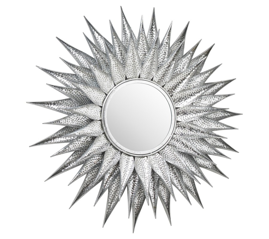 Originálne a výrazné okrúhle zrkadlo Solle je kúskom, ktorý na vašej stene začuene vynikne. Vďaka dizajnovému kovovému rámu v striebornej farbe v tvare lúčov dostáva zrkadlo art-deco nádych, ktorý je dnes veľmi populárny a vyhľadnávaný najmä v moderne ladených domácnostiach. Strieborné zrkadlo zaručene obohatí vašu obývačku, spálňu či luxusnú chodbu a vynikne na svetlých i tmavých stenách.